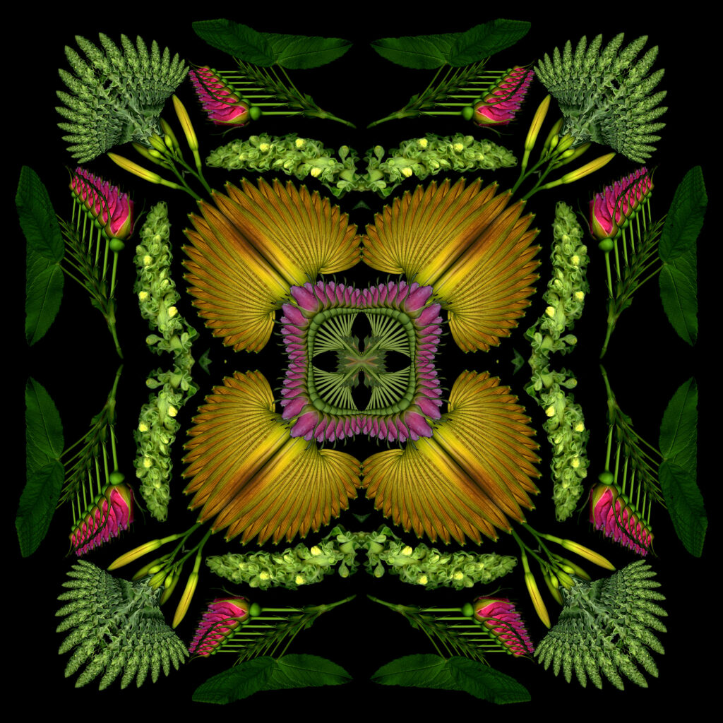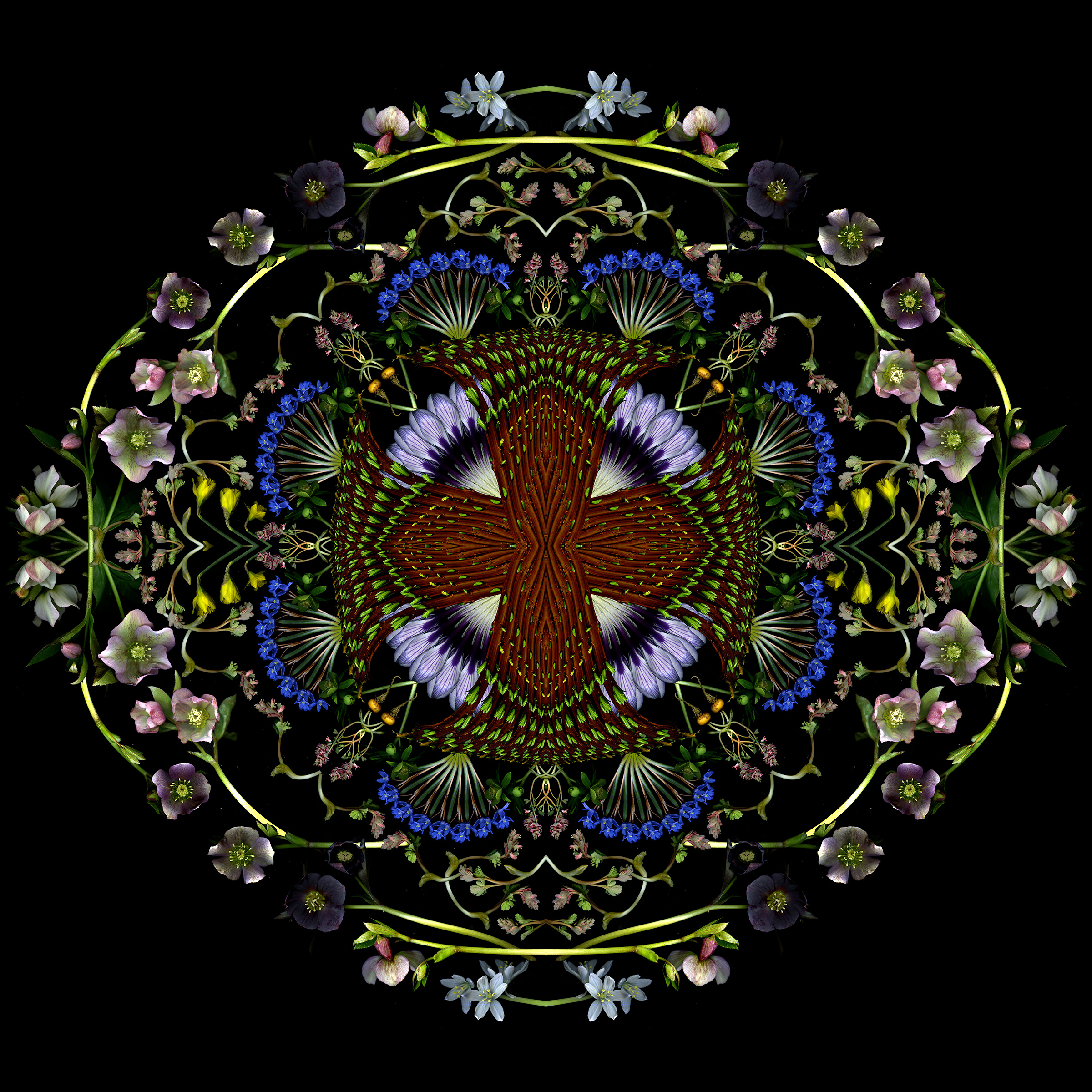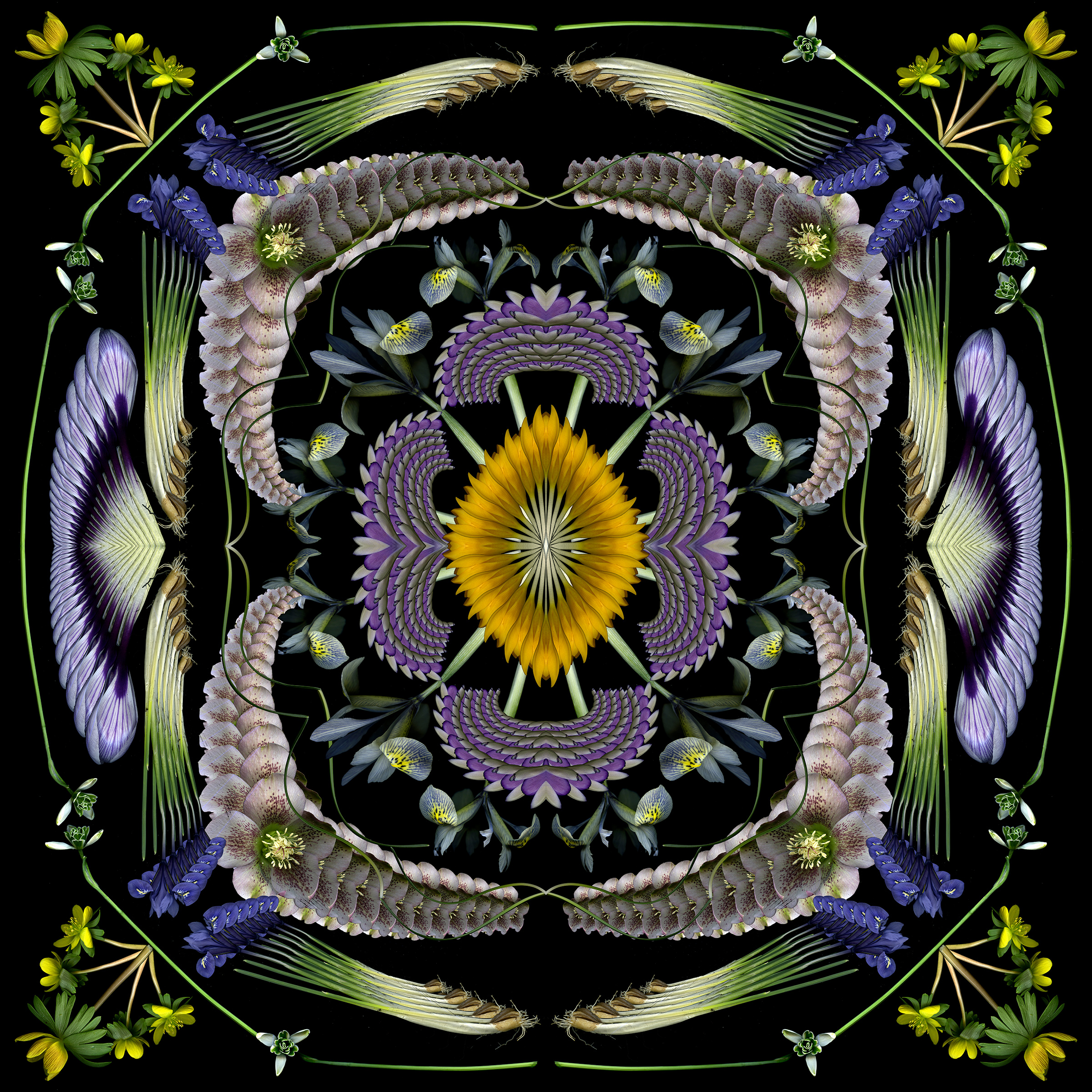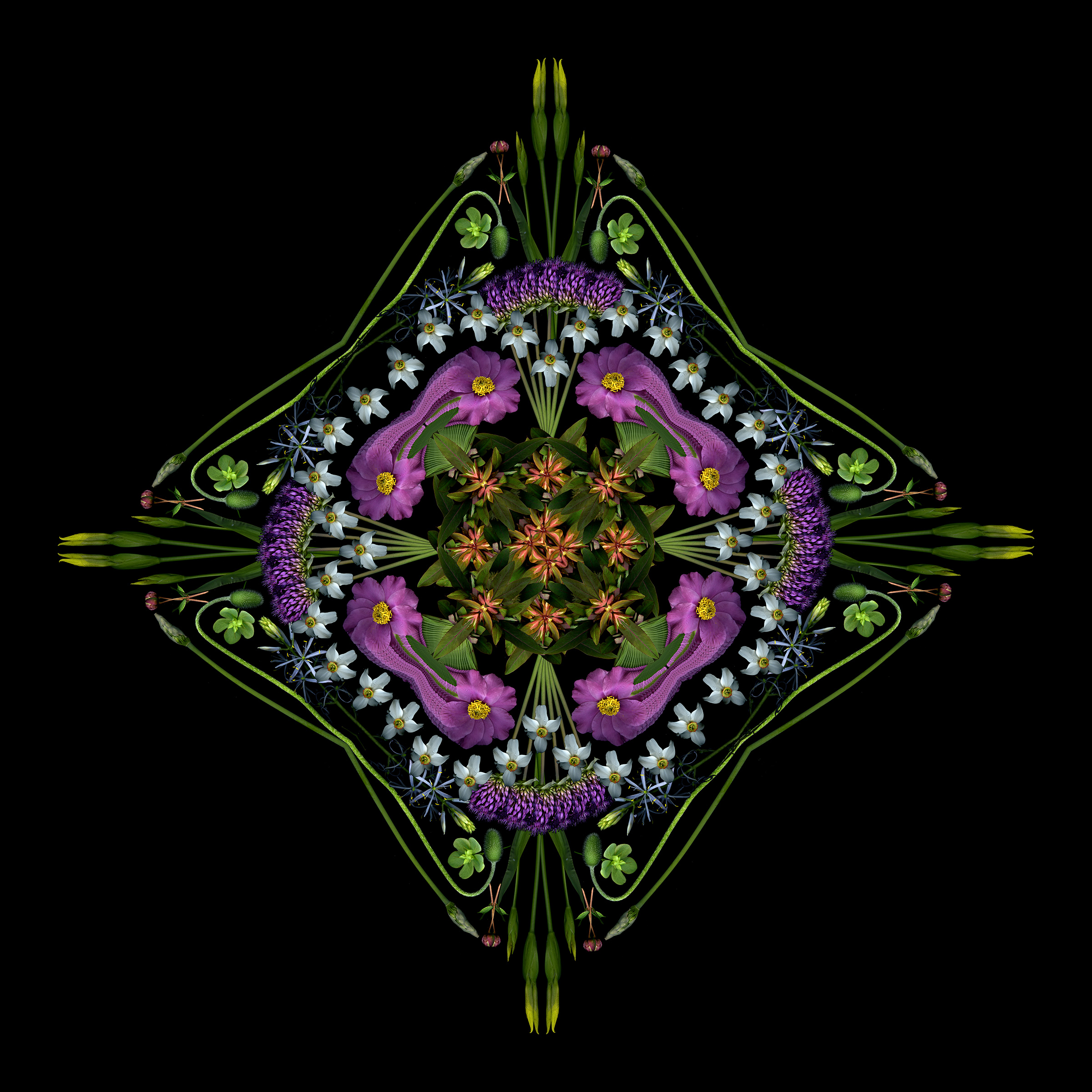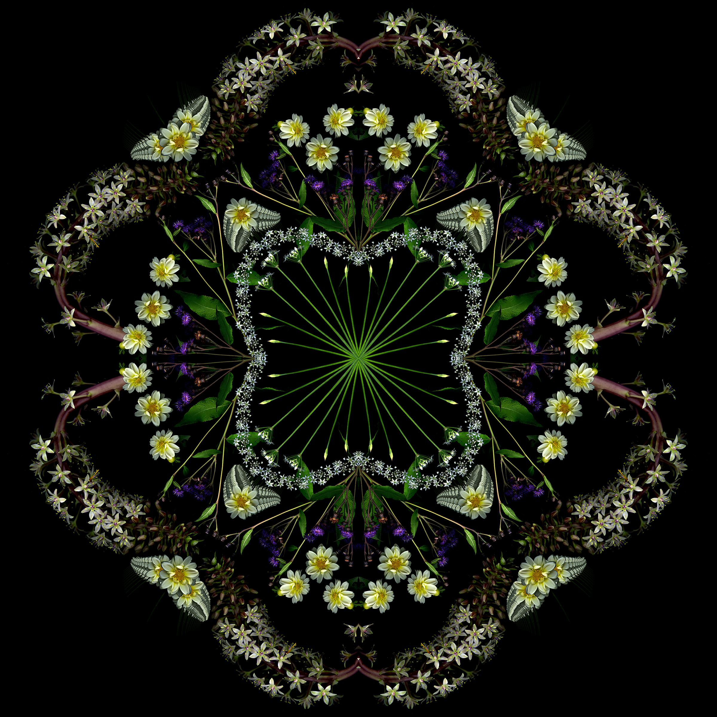 Still too cold to do fresh scans, though ephemerals are blooming early outside. So I used last year’s scans to create this 4-square that started as a bouquet and morphed into a mandala.