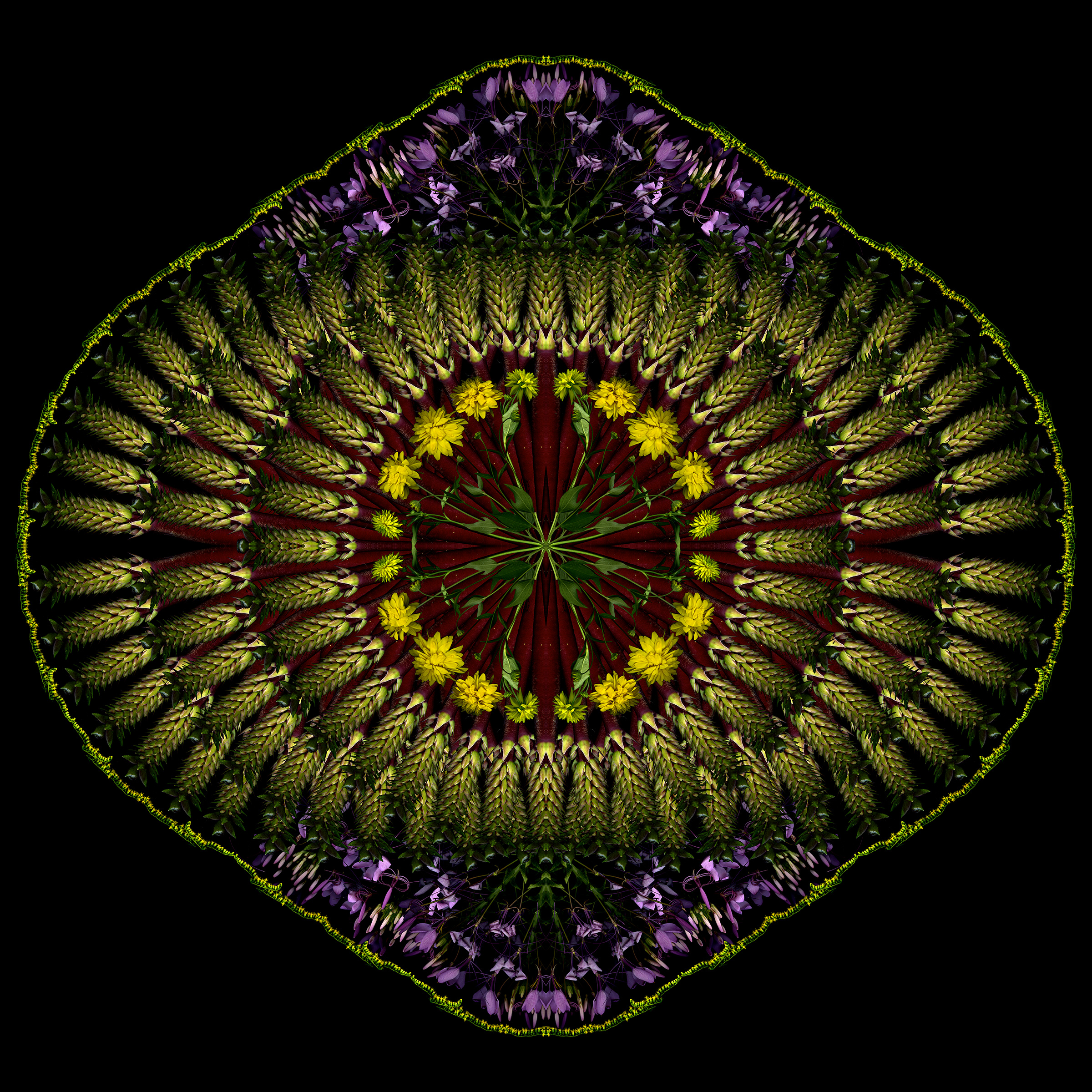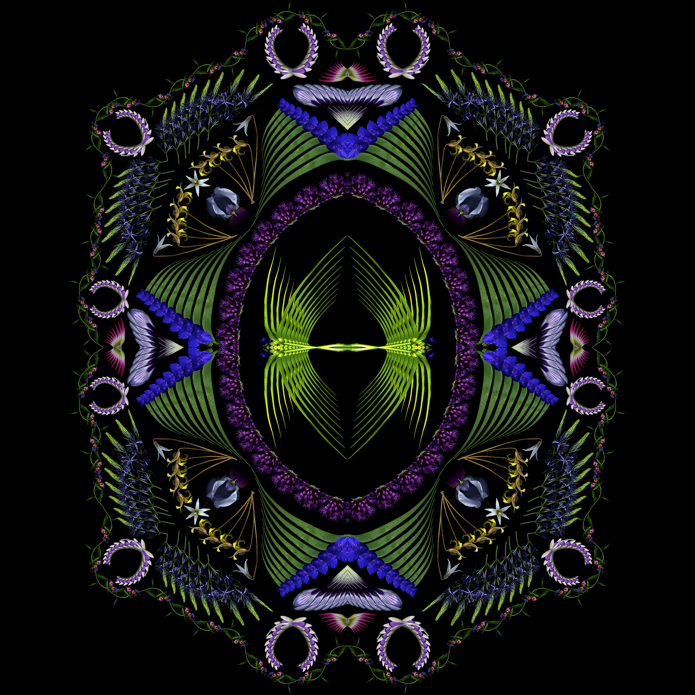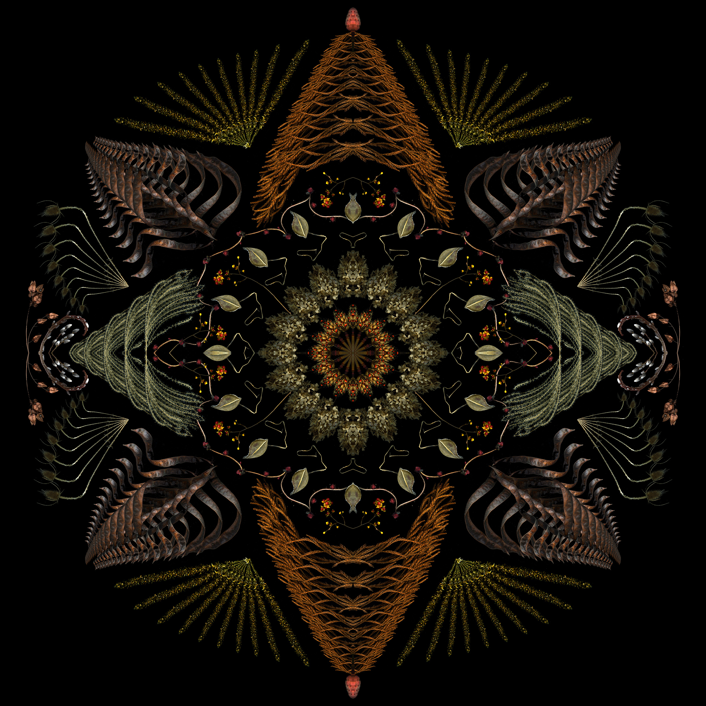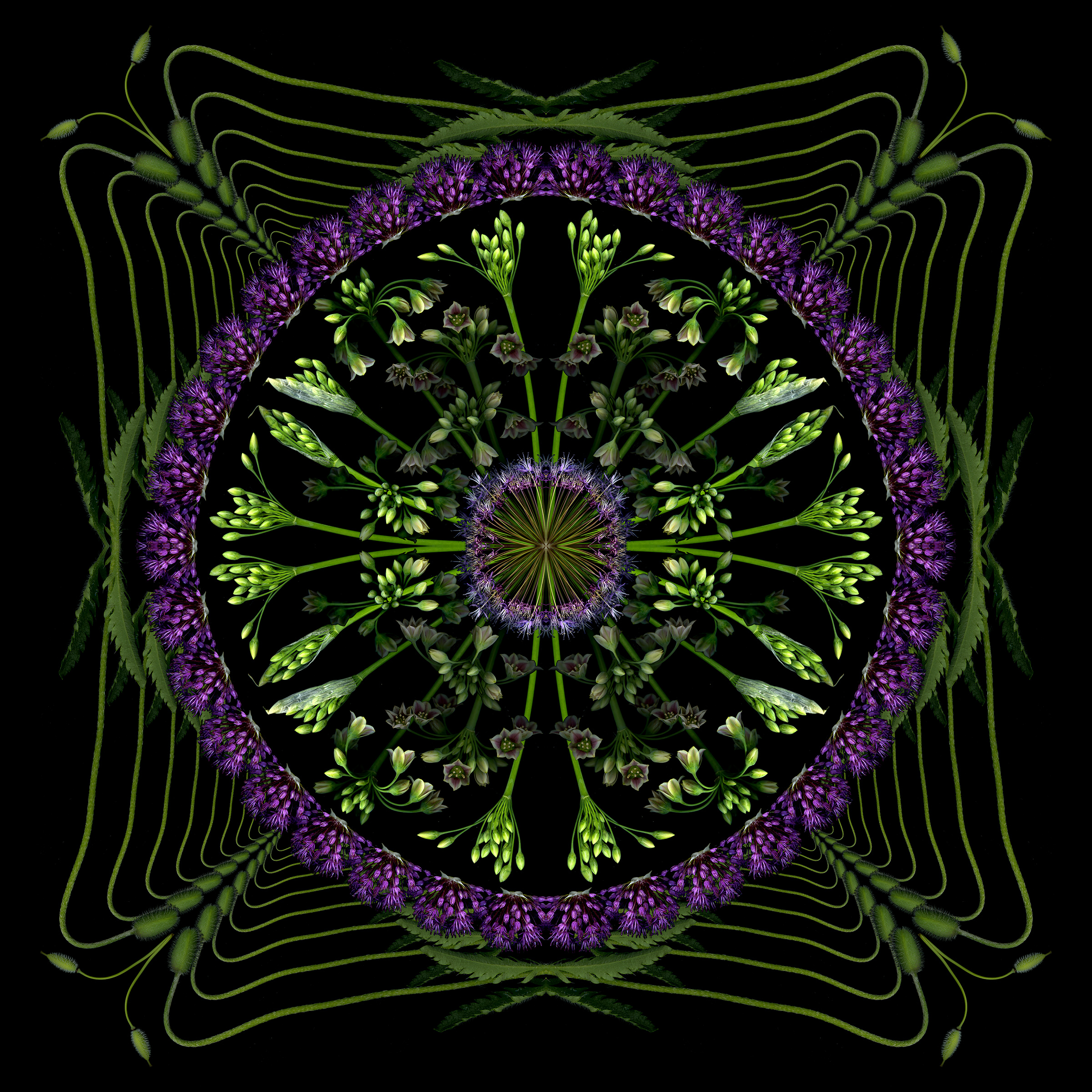 Still too cold to do fresh scans, though ephemerals are blooming early outside. So I used last year’s scans to create this 4-square that started as a bouquet and morphed into a mandala.
