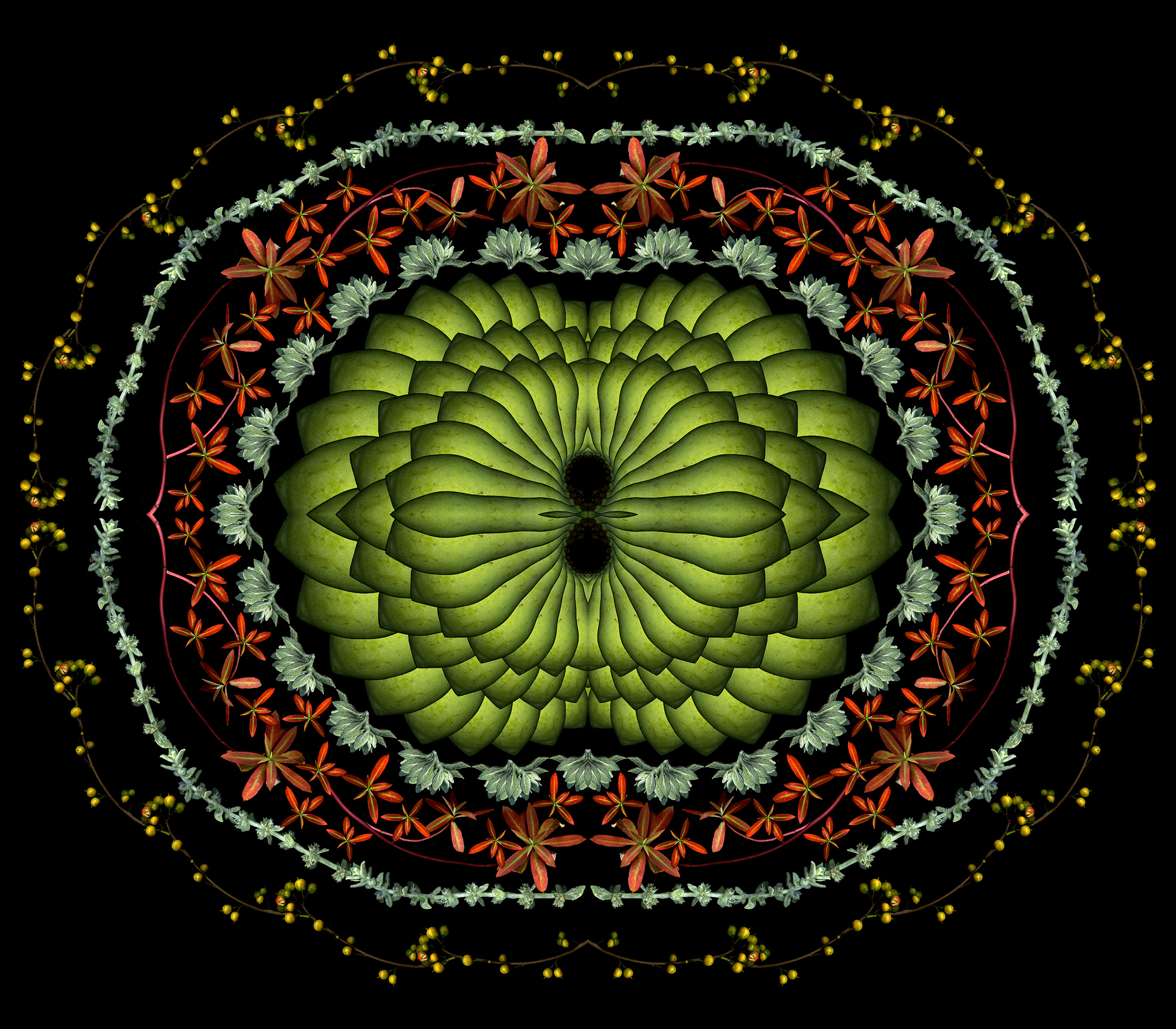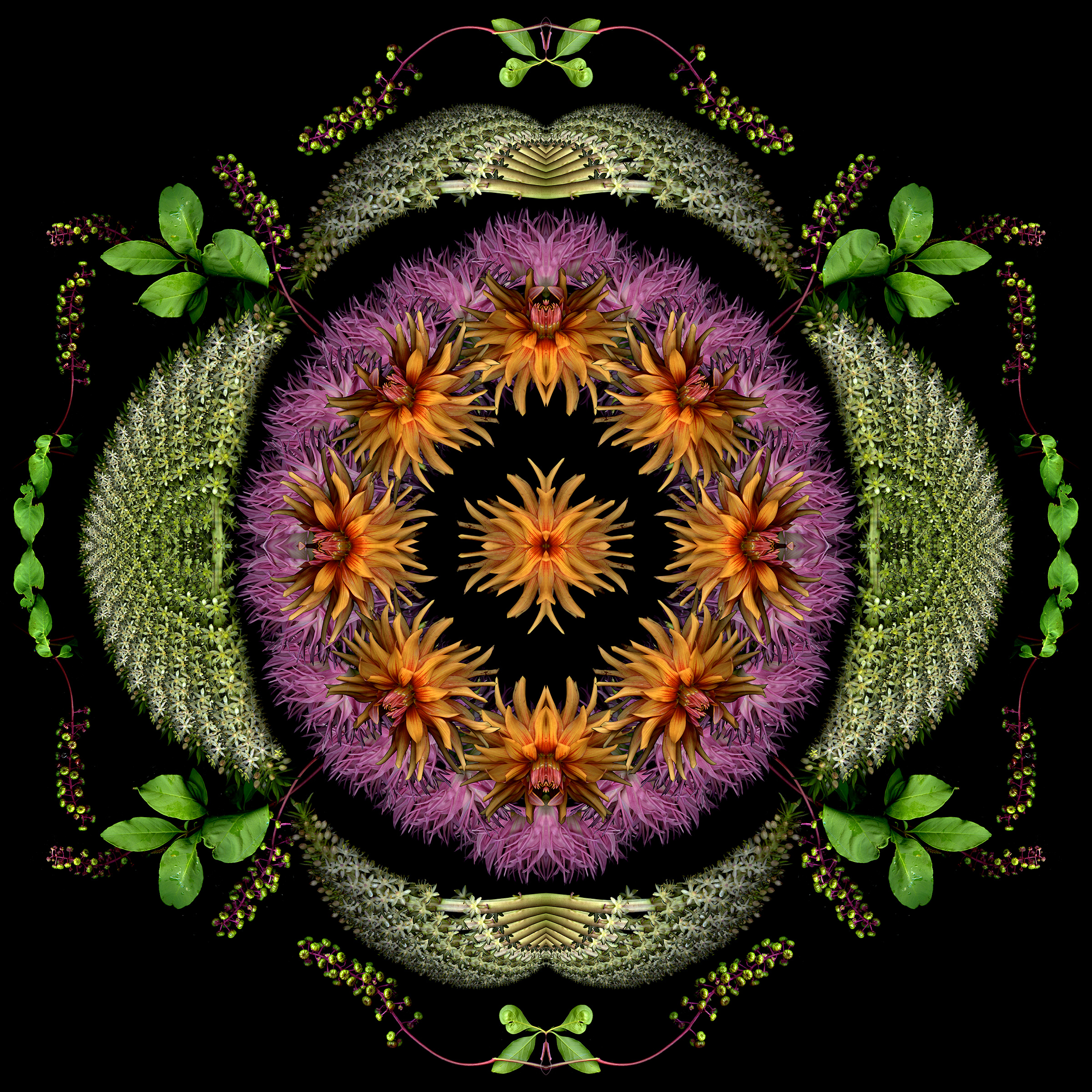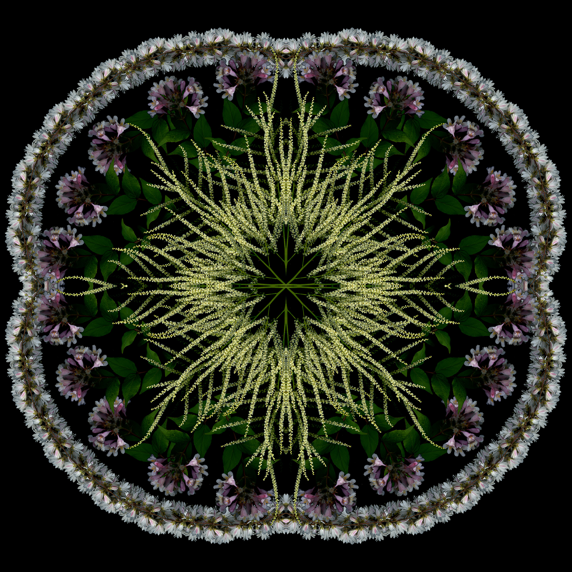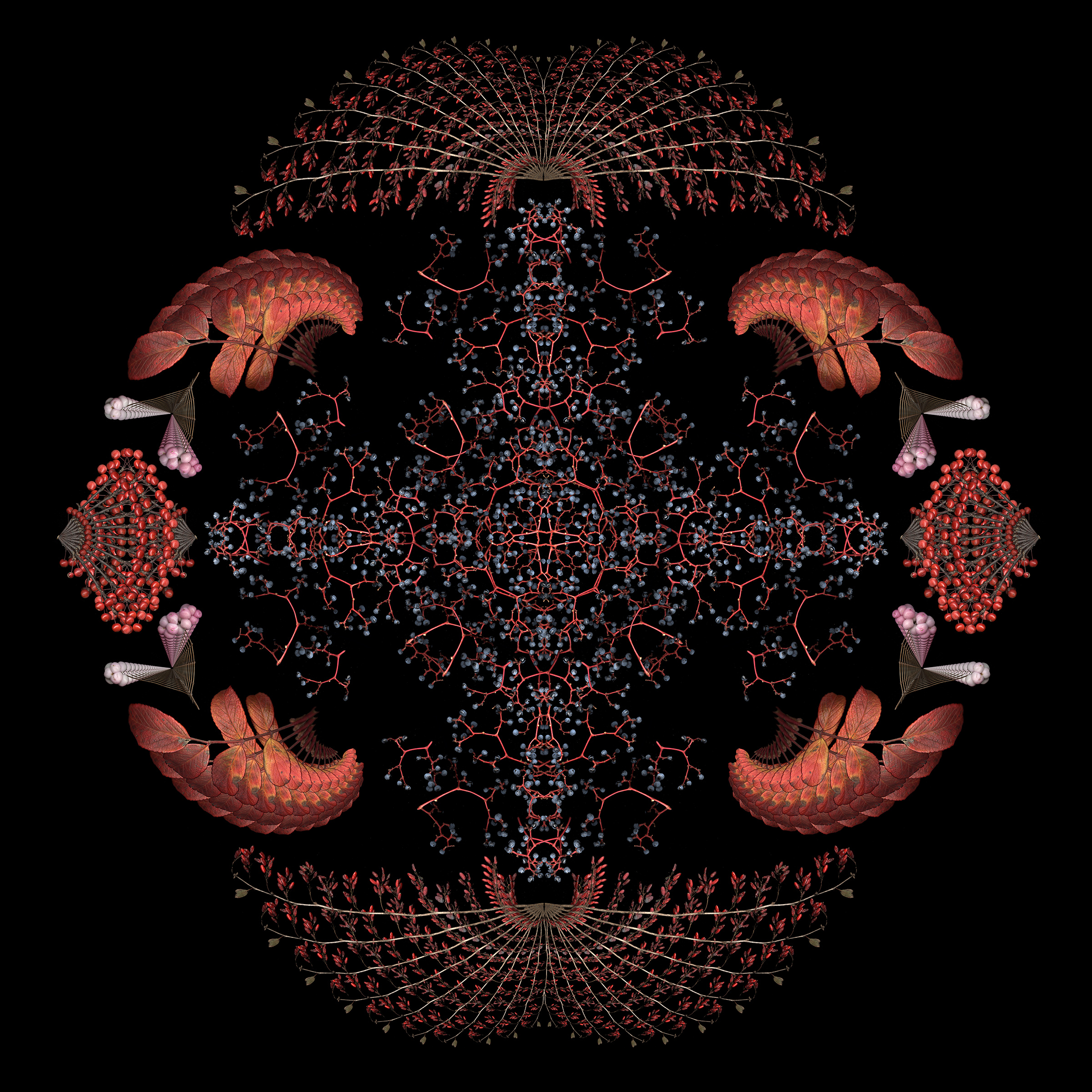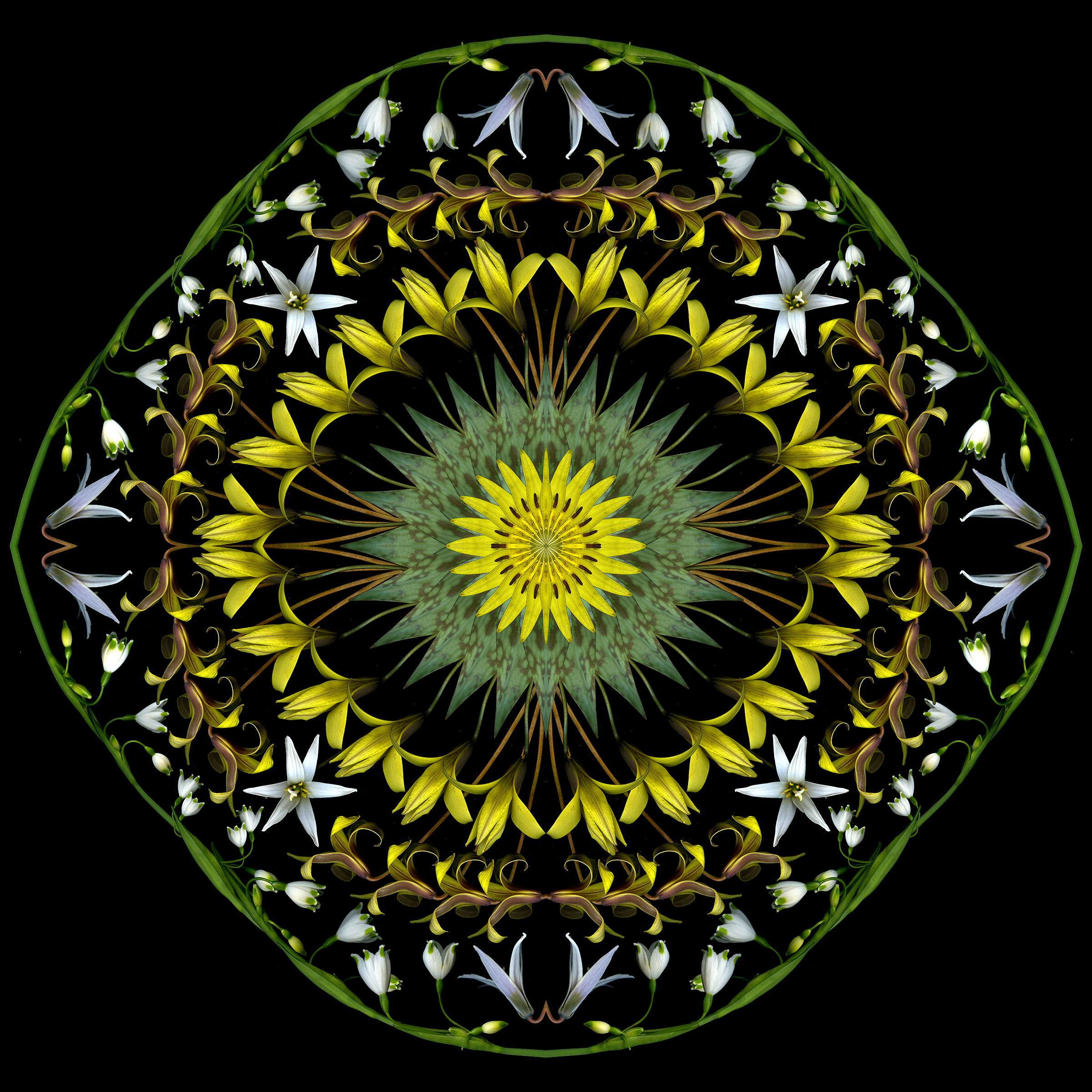 Still too cold to do fresh scans, though ephemerals are blooming early outside. So I used last year’s scans to create this 4-square that started as a bouquet and morphed into a mandala.