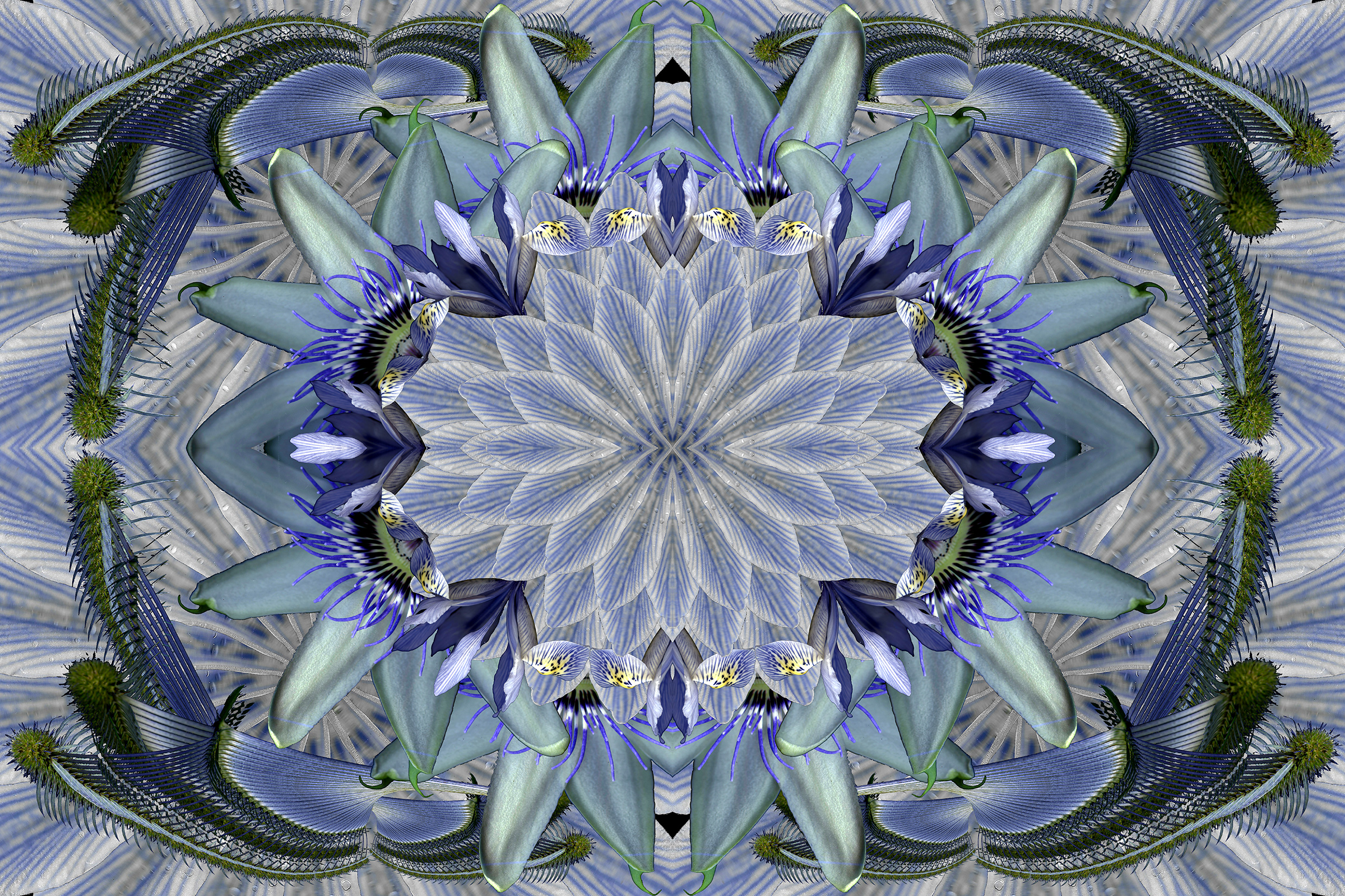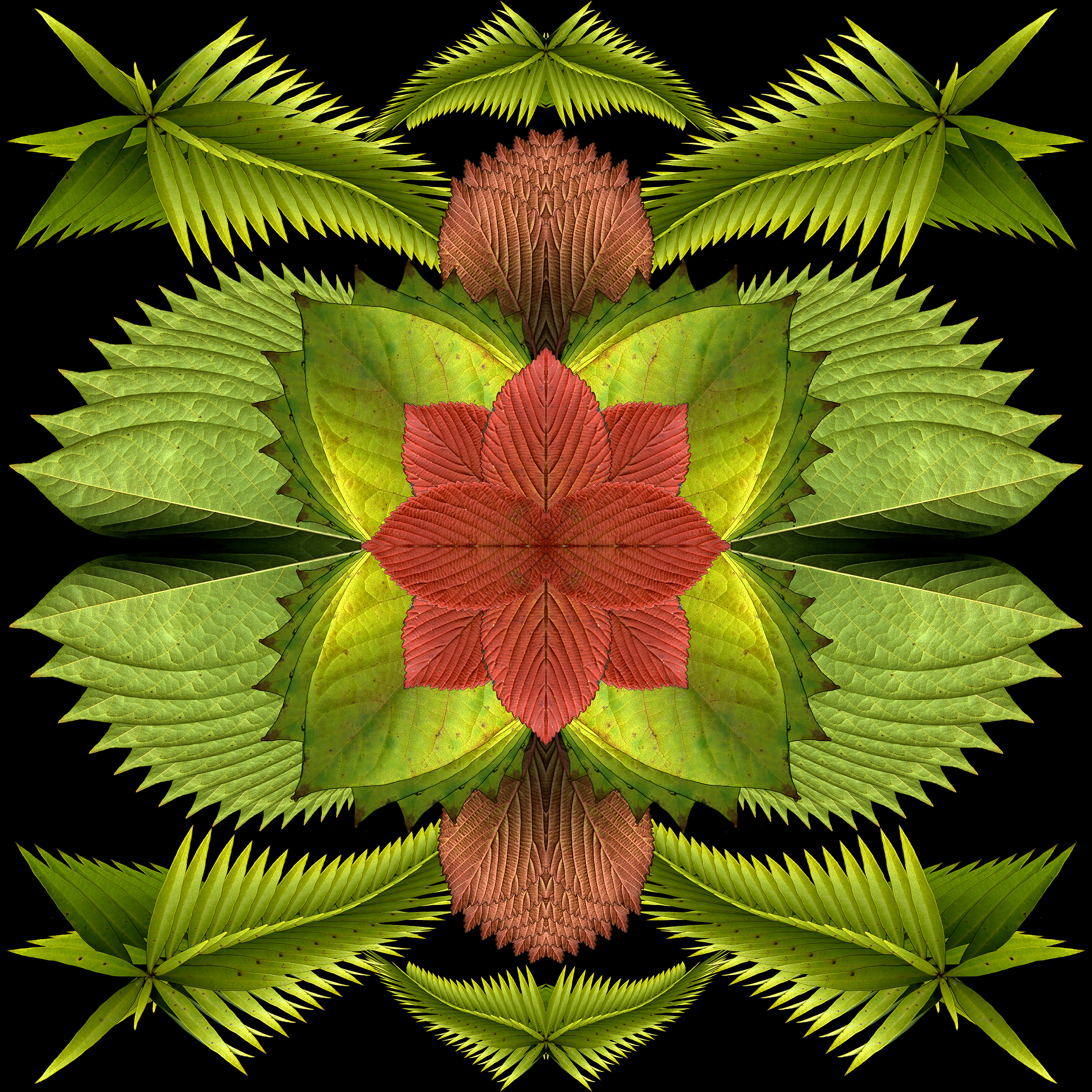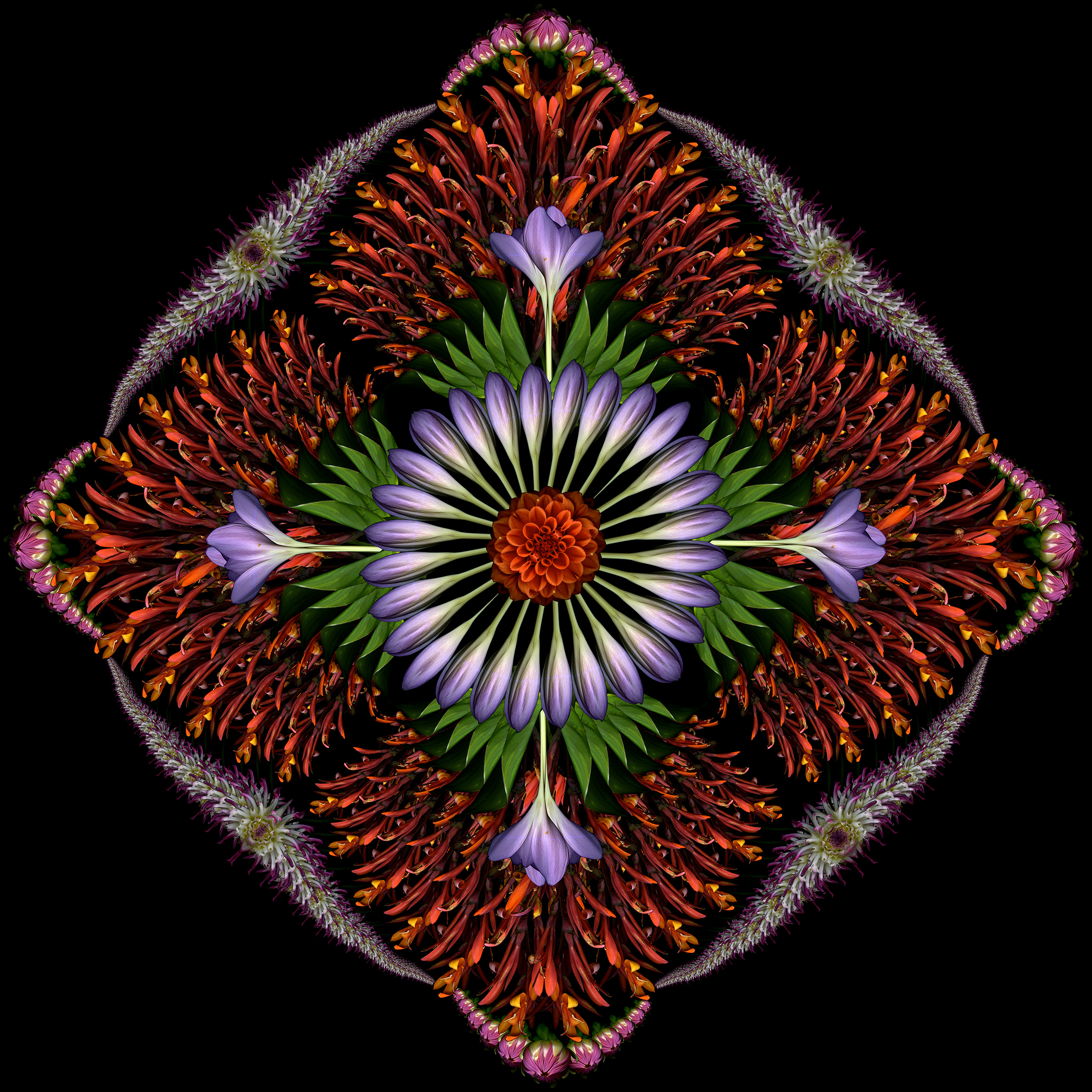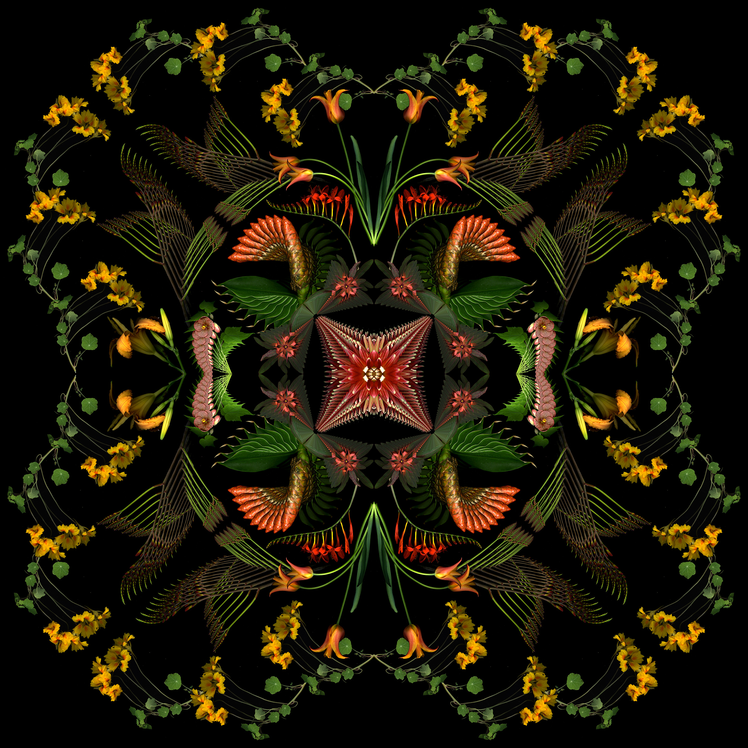 Still too cold to do fresh scans, though ephemerals are blooming early outside. So I used last year’s scans to create this 4-square that started as a bouquet and morphed into a mandala.