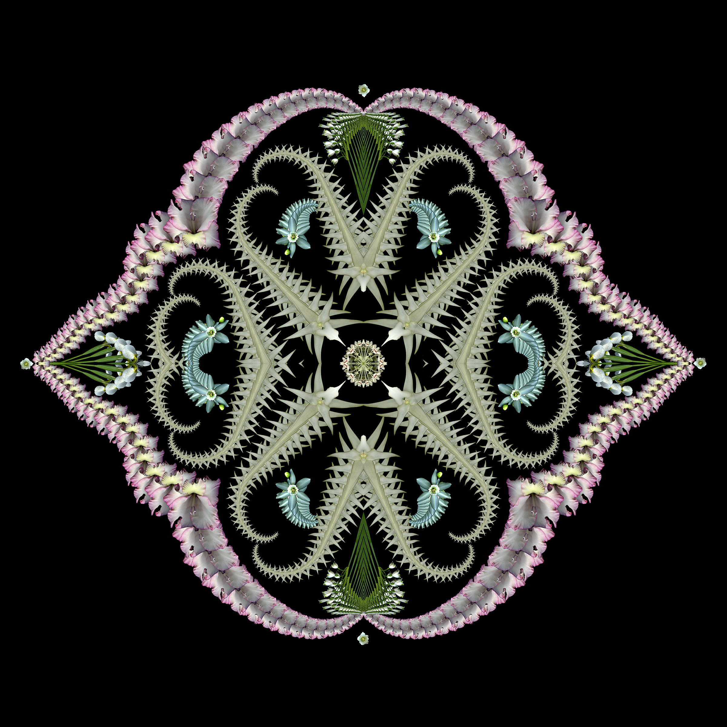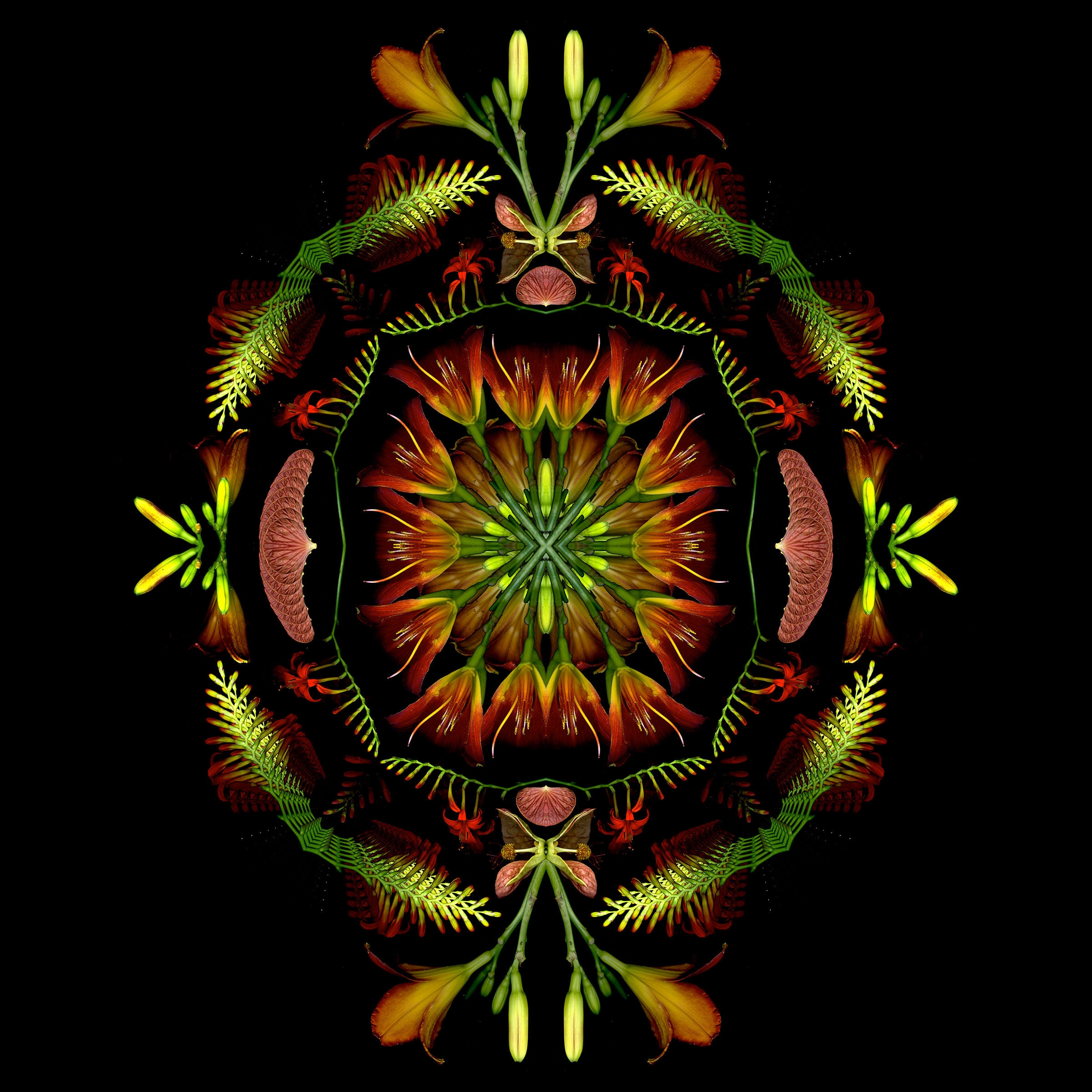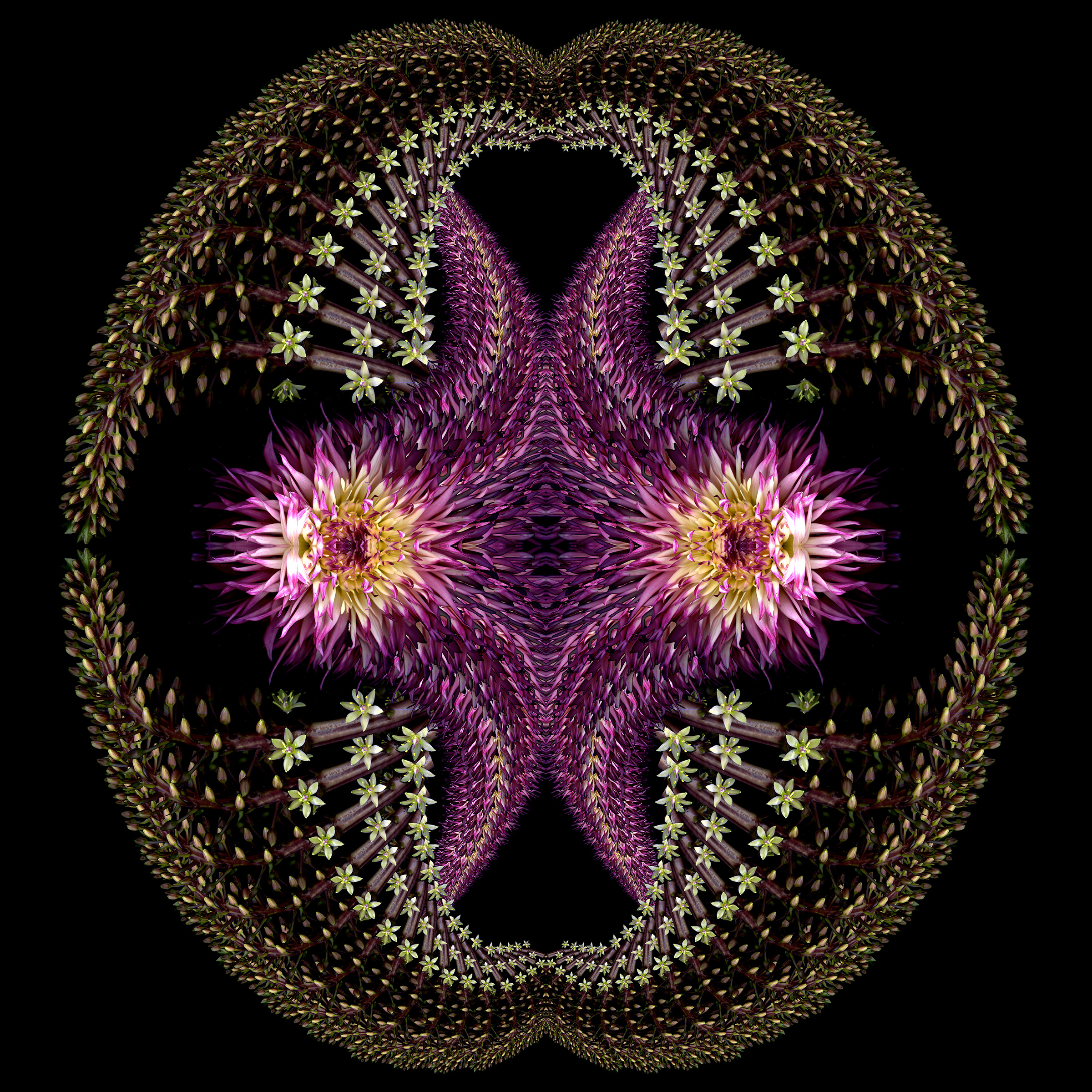 Mostly pinkish scans from 2024 reimagined. Center out: Water lily. Dahlia petals. Bromelliad. Rose. Gladiola. Snowberry. Oriental lily. Cereus. Dahlia. Pokeweed. Filipendula. Lori called it ‘Gorgeously baroque!’