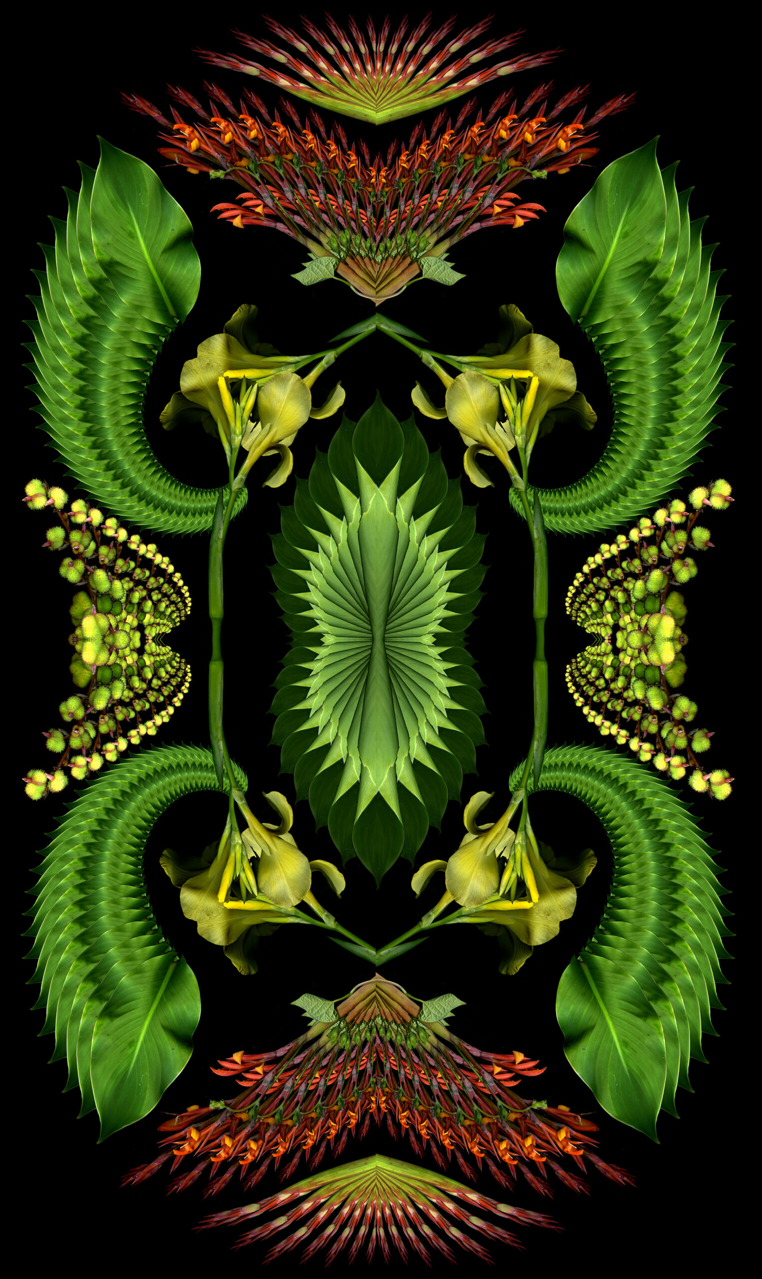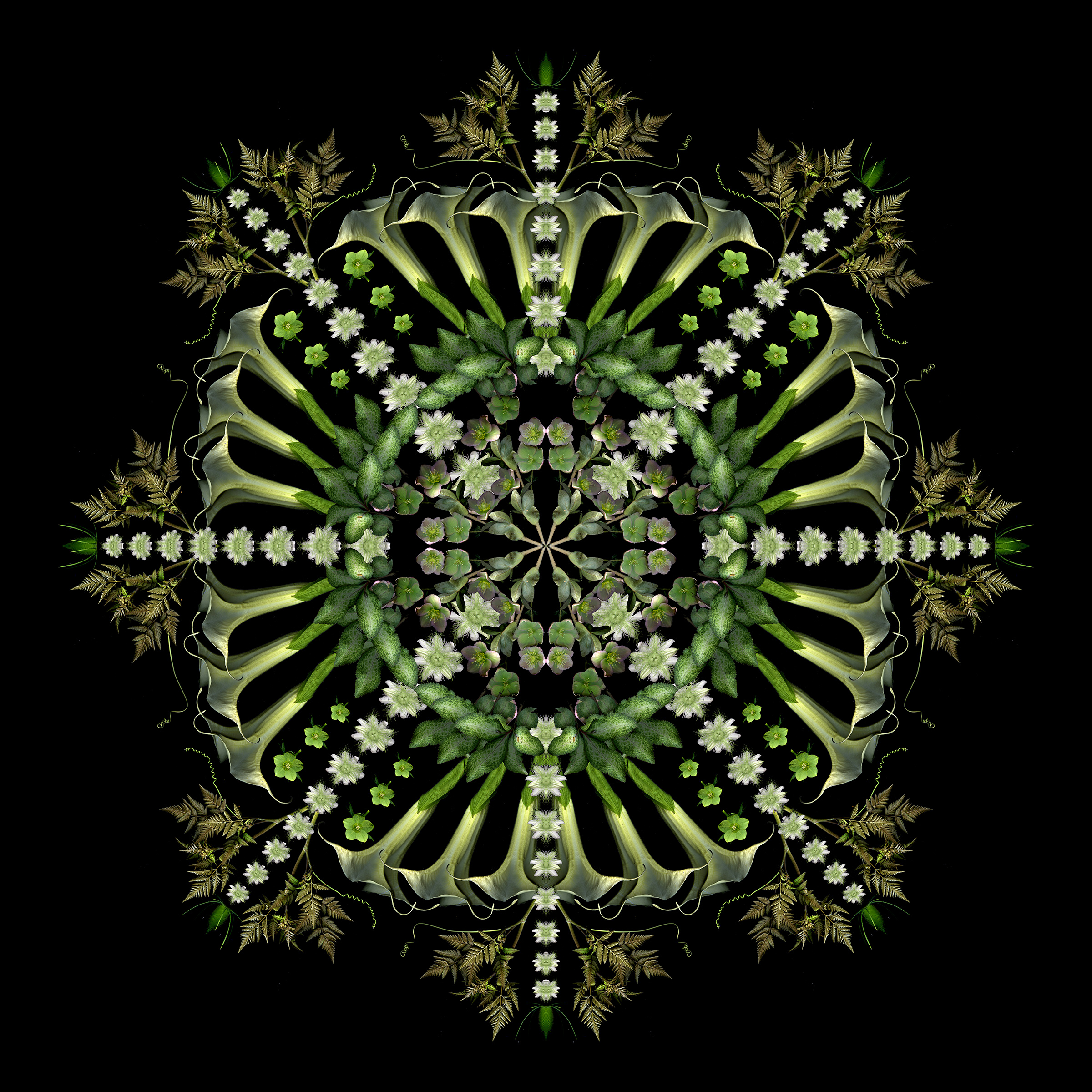 Hellebore flowers and foliage. Passiflora flowers and tendrils.  Brugmansia. Cow parsnip. Teasel.